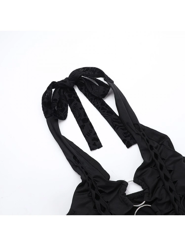 Halter,Hollow Out,Lace Up,Patchwork,Pure Color,Tie-wrap,Solid Color,Plain Color,Pullover
