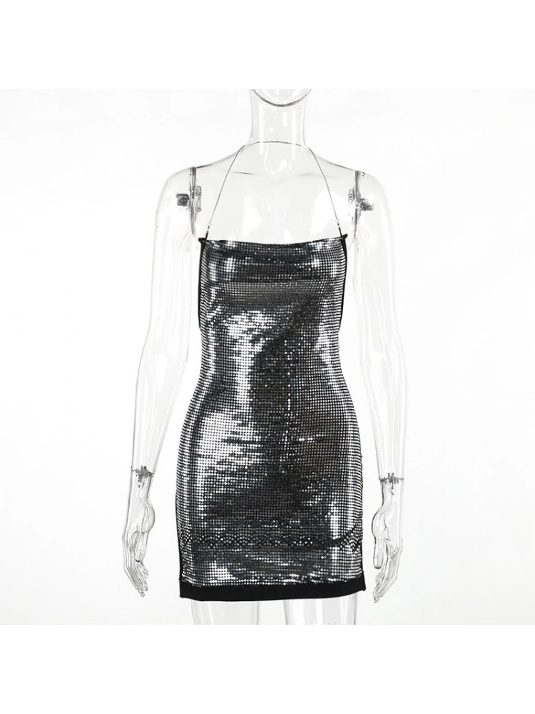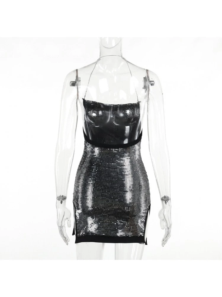 Chain,Halter,Patchwork,Pure Color,Sequin,Split Hem,Solid Color,Plain Color,Pullover